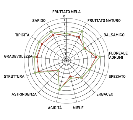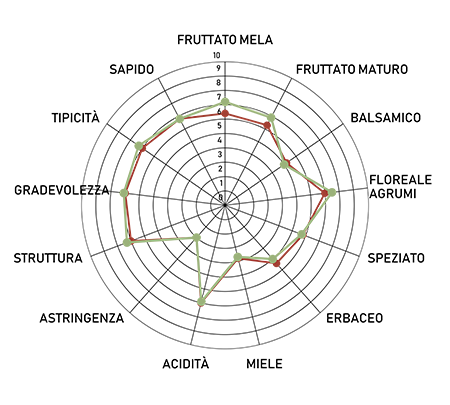 dà un vino di colore giallo con riflessi dorati, di profumo ampio e fresco, di sapore asciutto, rotondo, caldo, delicatamente aromatico; migliora con un leggero invecchiamento.