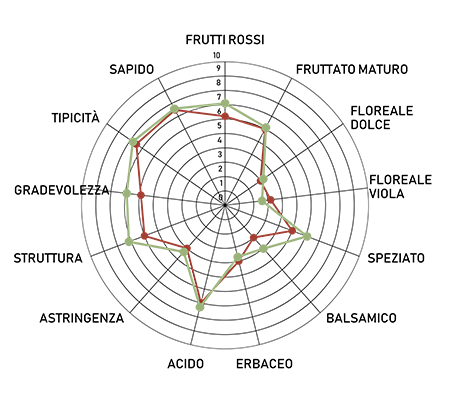 dà un vino di colore rosso rubino intenso, di profumo caratteristico, vinoso, di sapore asciutto, fruttato, tannico, non acido, di buon corpo, vellutato, giustamente alcolico. Dalla vinificazione in bianco si ottiene un ottimo vino rosato, sapido, fruttato, molto gradevole.